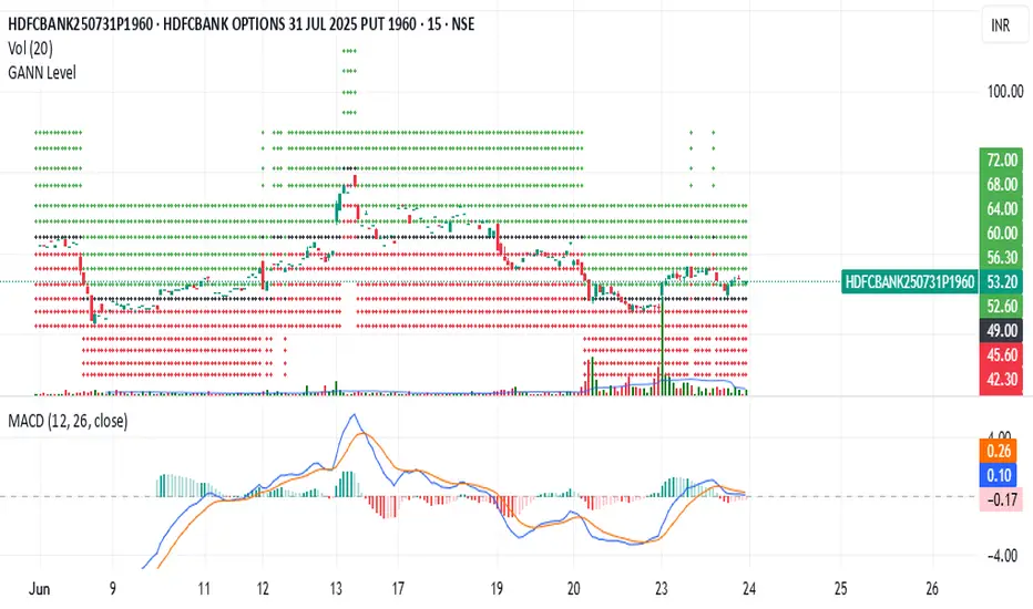 Dear GANN Level Users,We’re excited to announce an update to the GANN Level indicator! Now, there’s no need to manually input any values. Simply apply the indicator to any chart, and it will automatically calculate and plot GANN levels based on the square root of the opening price for the selected script.