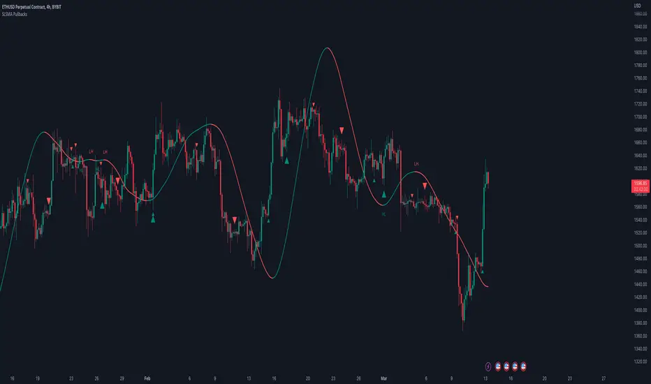 This script picks up two types of pullbacks using the SLSMA line. The pb1 signal picks up a fast first pullback as price action breaks the SLSMA line. The pb2 signal detects a stronger pivot with the trend. There is an option to filter pb1 signals with trend in the settings. Lower highs and Higher lows are displayed as labels along the SLMSA line. This tool can be overlaid on your chart or over an indicator using it as its external source.