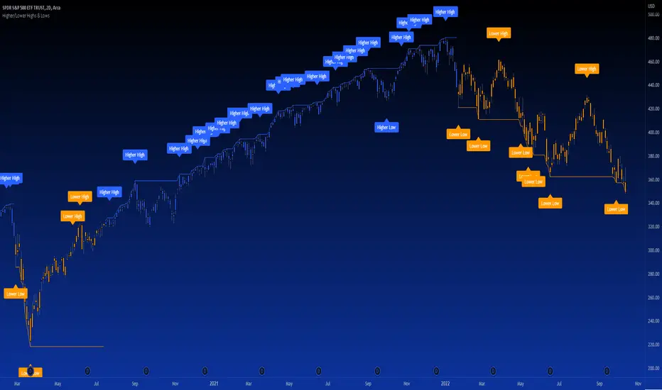 Please note: the triangles are plotted with a 1 bar offset, meaning you will receive the alert 1 bar after, since the script is waiting for a price drop/climb to validate a higher/lower high/low.