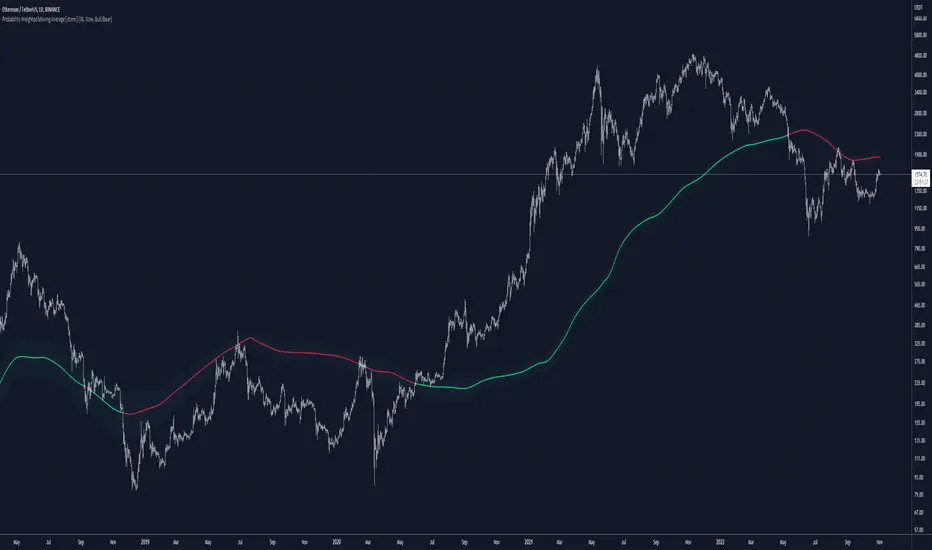 The Probability Weighted Moving Average uses a log-normal (continuous) distribution to calculate the probabilities of a range of lengths MAs to assess their performances, and respectively assign weights to a mean of this range. This assumes that the values of the MAs (call it A) aren't normally distributed, but instead log(A) is normally distributed, which can be a fair assumption. In P(t, t+X) where X is the number of trades assessed, it assumes the probability is not dependent on t and independent of previous price.