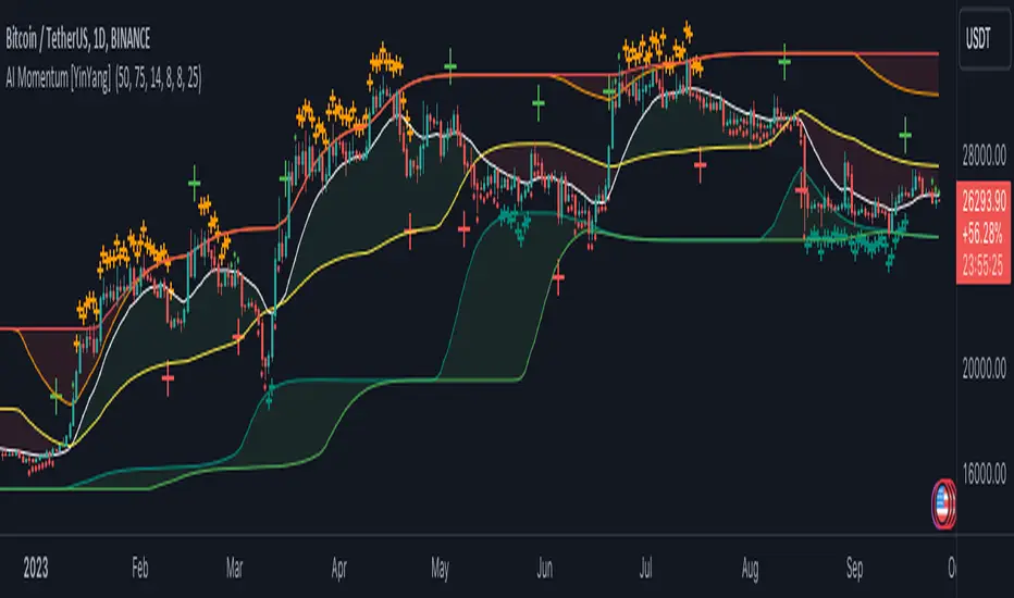 AI Momentum is a kernel function based momentum Indicator. It uses Rational Quadratics to help smooth out the Moving Averages, this may give them a more accurate result. This Indicator has 2 main uses, first it displays ‘Zones’ that help you visualize the potential movement areas and when the price is out of bounds (Overvalued or Undervalued). Secondly it creates signals that display the momentum of the current trend.