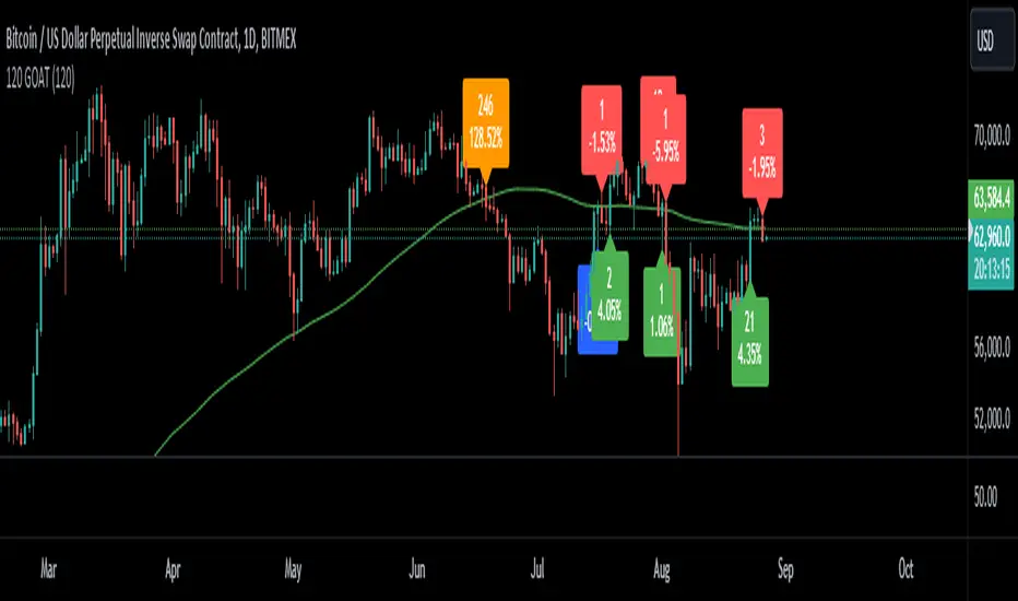 The 120 GOAT indicator is a powerful tool designed to help traders identify key breakout points relative to the 120-day Simple Moving Average (SMA). This indicator tracks when the price crosses above or below the 120-day SMA, marking these transition points on the chart with dynamic labels that indicate the percentage change in price since the last crossover.