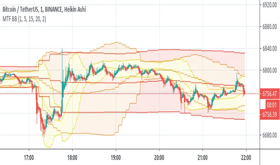 Script which plot multi-timeframe bollinger bands, up to 3 different timeframes. It is intended to show higher timeframe bands on a smaller timeframe. Default options are 1m, 5m and 15m and used on a 1m chart for crypto-currencies.