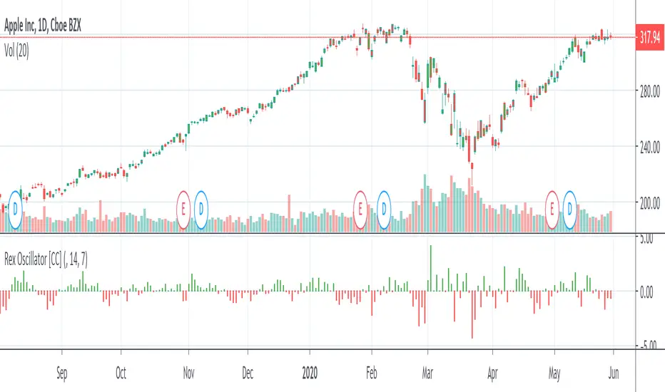 The Rex Oscillator measures market behavior based on the relationship of the close to the open, high and low values of the same bar. A big difference between the high and close on a bar indicates weakness, and wide disparity between the low and close indicates strength. The difference between open and close also indicates market performance. Buy when the indicator is green and sell when it turns red.