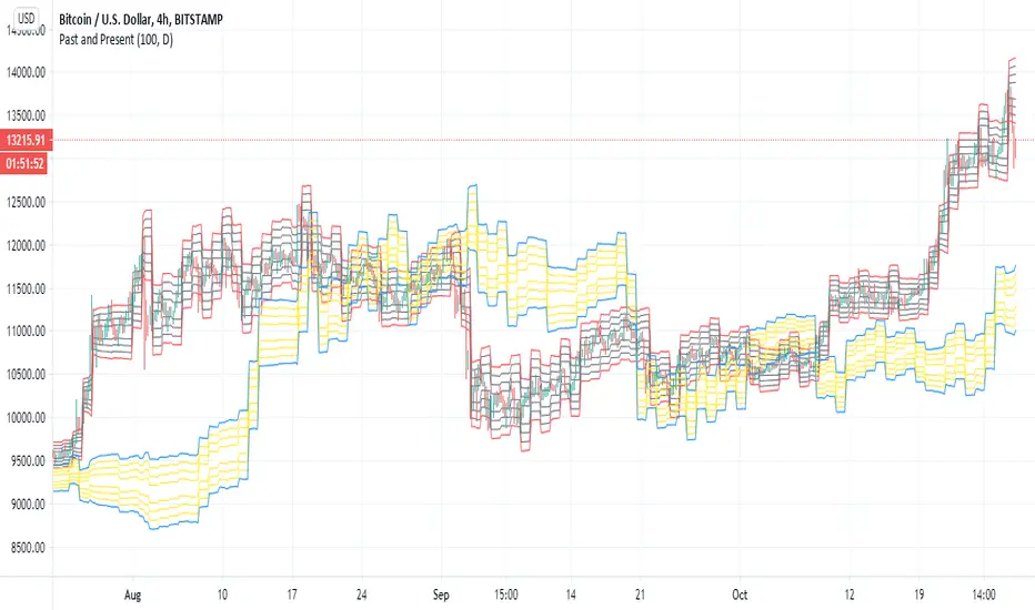 once the bands depart from each other -present cross up the past then it will be bullish signal and vice versa when price depart from present band it will tend to fall to the level of our past band