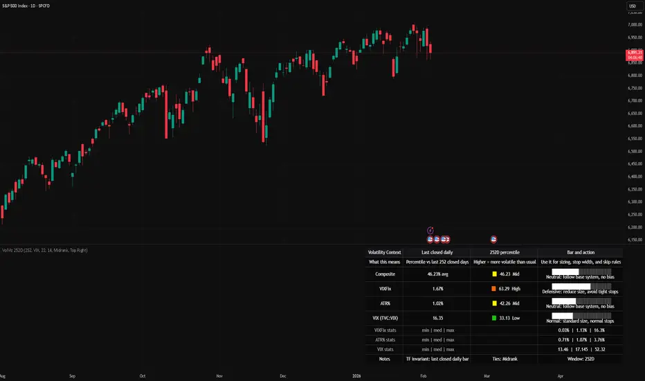 A volatility regime dashboard for liquid instruments that converts three volatility lenses into 0 to 100 percentile ranks versus the last 252 closed daily bars. It is built to answer one question: is volatility unusually low or unusually high relative to the last year. Use it to adjust position sizing, stop width, and trade selectivity. It is not a directional signal.