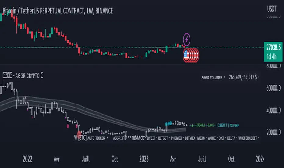 The Multi-Exchange Crypto Aggregator is a unique concept ticker that gathers up to 10 tickers into one. A new OPAL Chart is created as an indicator, with its own candles and information. This information is meant to be interpreted as average information in order to reduce noise from a single ticker only. Everything is automated between assets. Our script will always check and ensure that data is received for calculations; otherwise, invalid tickers are ignored. This version is designed for Crypto Perpetual markets.
