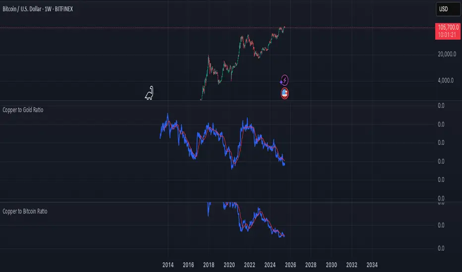 Ratio: Divides copper price by Bitcoin price (copper / bitcoin). Since copper is in USD per pound and Bitcoin is in USD, the ratio is unitless but reflects copper’s value relative to Bitcoin.