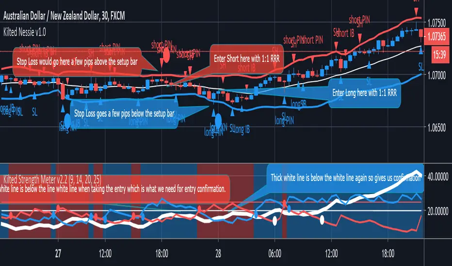 1. If you are using the Kilted Strength Meter and you like using Bollinger bands then there is no reason why you can’t take trend based trades also when you see evidence of a trend starting, which is why we have added options to show Pin Bars, Inside Bars and swing highs and swing lows if you are a swing based trader. Yes this gives you a single indicator that provides you with trading opportunities when the market is going sideways and when the market is trending which is what we love about the Kilted Nessie. If you are just using the indicator to trade a sideways market then we recommend that you “untick” these options to keep things nice and simple instead.