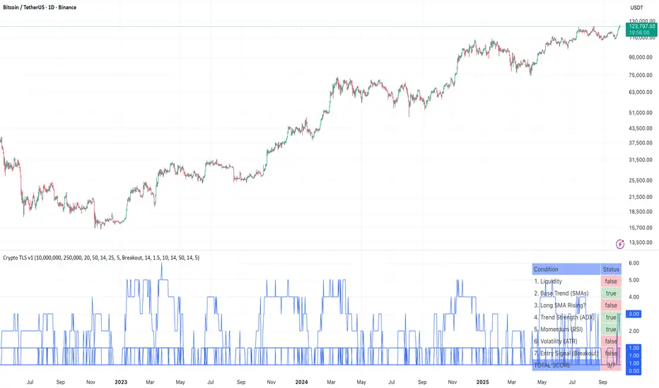 - Single-Asset Analysis: When you apply the script to any crypto chart, a detailed diagnostic table will appear in the bottom-right corner. This table provides a real-time checklist, showing true or false for each of the 7 conditions and the final score, allowing for a quick and deep analysis of any individual asset.