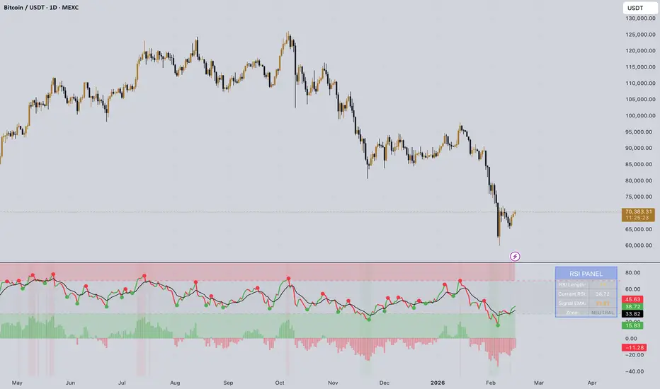 Clearly shaded zones above and below your defined overbought and oversold levels. The background of the panel also changes color when RSI enters these extreme zones, giving you an immediate visual alert.