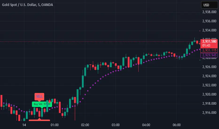 Sell Volume Label: When a sell signal occurs, a red label is displayed below the candle with the text "Sell Vol: X.XX%", where X.XX is the volume percentage.