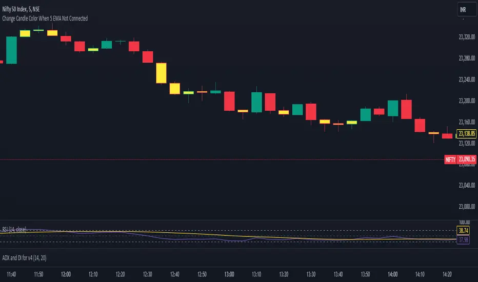 This custom TradingView indicator changes the color of candlesticks to yellow whenever the 5-period Exponential Moving Average (EMA) is not "connected" to the current candle.
