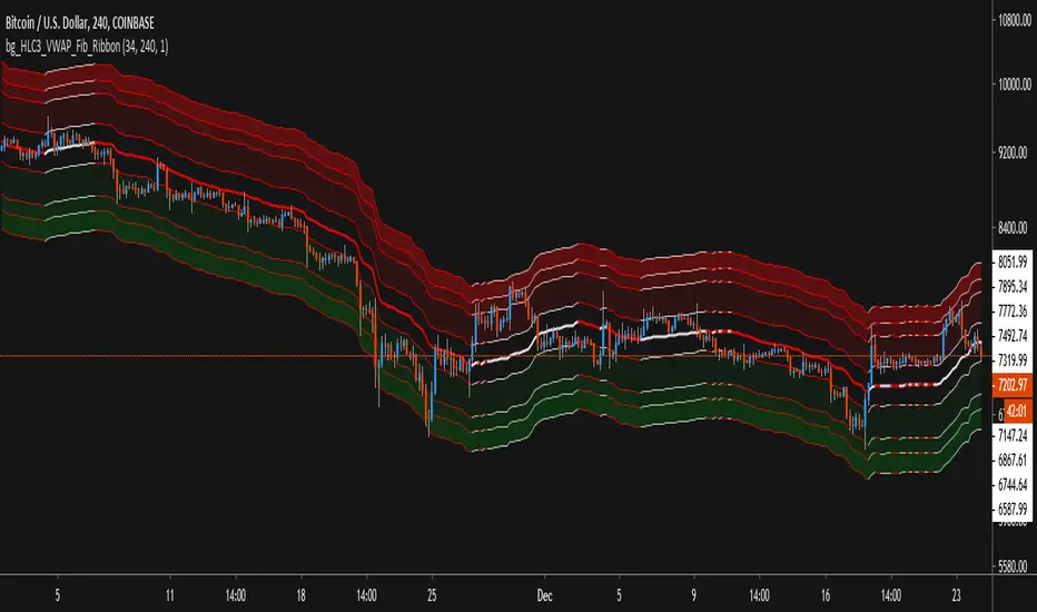 This Script use Volume Weighted Average Price (VWAP) combined with Fibonacci Deviations of that value as Ribbons to show Support and Resistance levels, as well as estimate good Buy and Sell areas based on the extremity of distance from the central VWAP.
