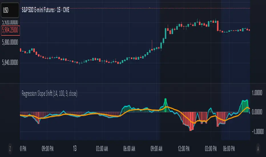 This indicator detects subtle shifts in price momentum using a rolling linear regression approach. It calculates the slope of a linear regression line for each bar over a specified lookback period, then measures how that slope changes from bar to bar.