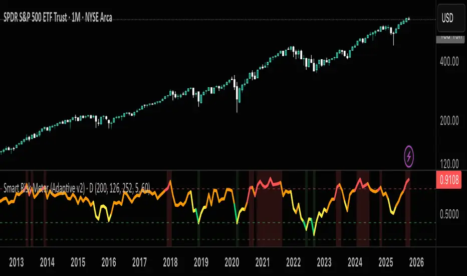 The **Smart Risk DCA Meter** is an adaptive market-risk indicator that helps you invest smarter by scaling your DCA buys based on actual market conditions instead of emotion. It combines momentum, distance from trend, and drawdown factors into a single 0–1 risk score that automatically adjusts to each asset’s volatility — from stable indices like SPX to high-beta assets like BTC. Low readings (green zones) signal opportunity to buy heavier, while high readings (red zones) warn to slow down and protect capital.