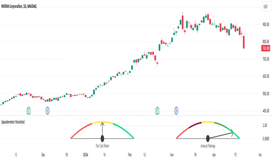 The first example demonstrates how to visually represent the analysts' ratings for a stock using the built-in syminfo.recommendations. The speedometer is divided into five segments, each representing a different level of analyst recommendation: strong sell, sell, hold, buy, and strong buy.