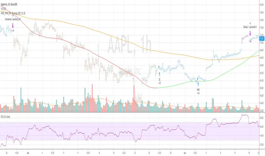 This strategy BUYS when HMA is below EMA (default setting is 200) and HMA turning to green and RSI 13 is below 70