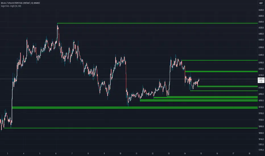 Single Prints - Bright is a Pine Script indicator designed to identify and visualize significant price levels based on the concept of "single prints." Single prints are price levels where trading activity occurred but with little or no follow-up trading. This indicator plots these levels as lines on the chart, allowing traders to easily identify areas of potential support and resistance.Features:
