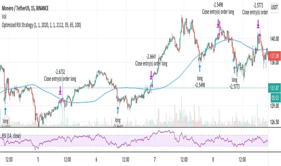 Buy low and sell high is every trader's mantra. While this approach looks straightforward in theory, it's sometimes challenging to put into practice. That requires stress-management to buy when price drops and resolution in selling when the price is rising. RSI is a useful tool to implement long-term and effective trading strategies. The script presents an optimized RSI trading strategy that uses a Moving average to spot the best time to buy the dip.