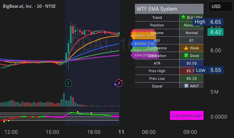 The MTF EMA Trading System transforms simple moving average analysis into a sophisticated, multi-confirmation trading strategy. By combining trend alignment, momentum, volume, and confluence, it helps traders identify high-probability setups while filtering out noise and false signals. The clean interface and comprehensive dashboard make it suitable for both beginners and experienced traders across all markets and timeframes.