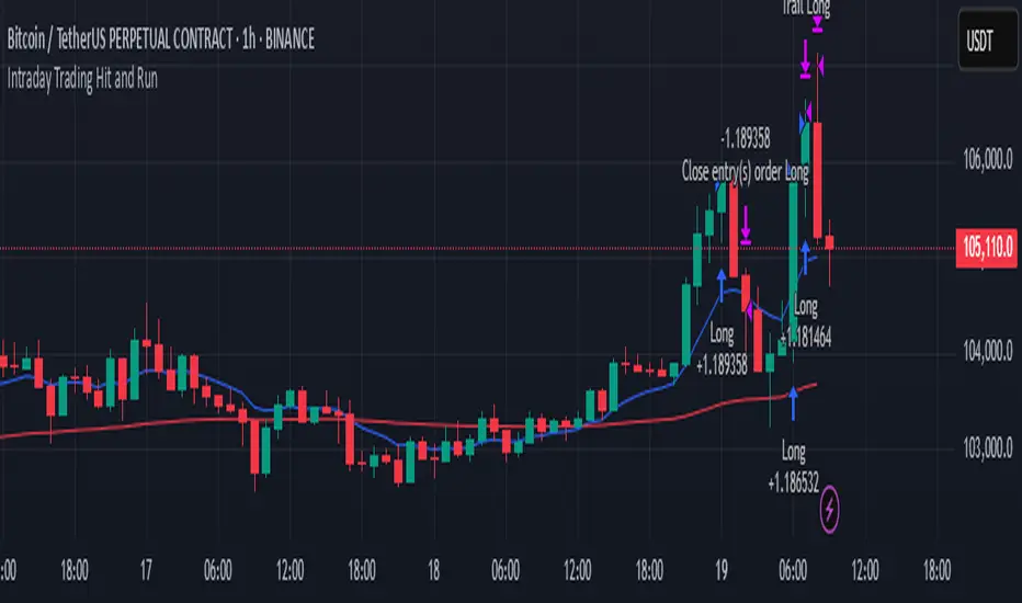 The strategy looks for strong, high-volume momentum moves in the direction of the established trend (as determined by EMAs). It jumps in quickly ("hit") when conditions align, then protects gains with an automatic trailing stop ("run"). Designed for fast markets where trends develop rapidly.
