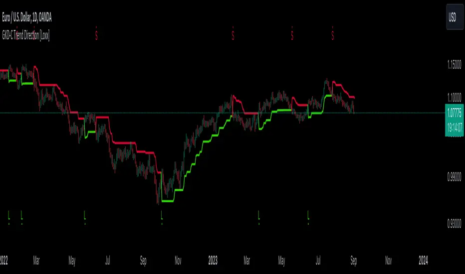 Trend Direction relies both on the Average True Range (ATR) – a measure of market volatility – and the market's closing price. If ATR Smoothing is set to greater than 0, the ATR is smoothed using an Exponential Moving Average (EMA). This ATR is then multiplied by a factor to derive a threshold. Using this threshold and the market's close price, the code determines the position of the plotted line. The plotted line's color changes based on the close price's relationship to this derived value: green if the close price is above, and red if below, signifying the trend's upward or downward direction respectively.