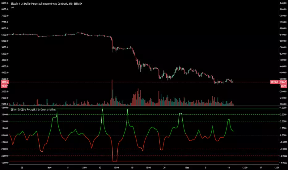 The RocketRSI is an indicator that combines the approach used in the calculation of the Relative Strength Index (RSI) with some principles of signal processing and was developed by John Ehler. By smoothing out noisy price data and singling out a cyclic component within it, the indicator can be used for analysis of cyclic reversals, which could potentially signal trading