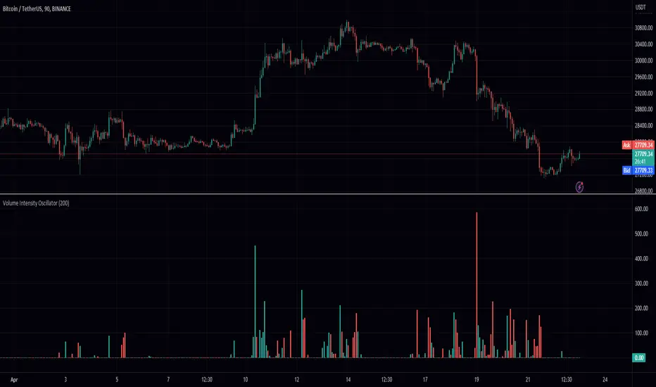 A visually appealing display, with the Volume Intensity Oscillator represented as columns in different colors based on the direction of the market movement (red for bearish and green for bullish).