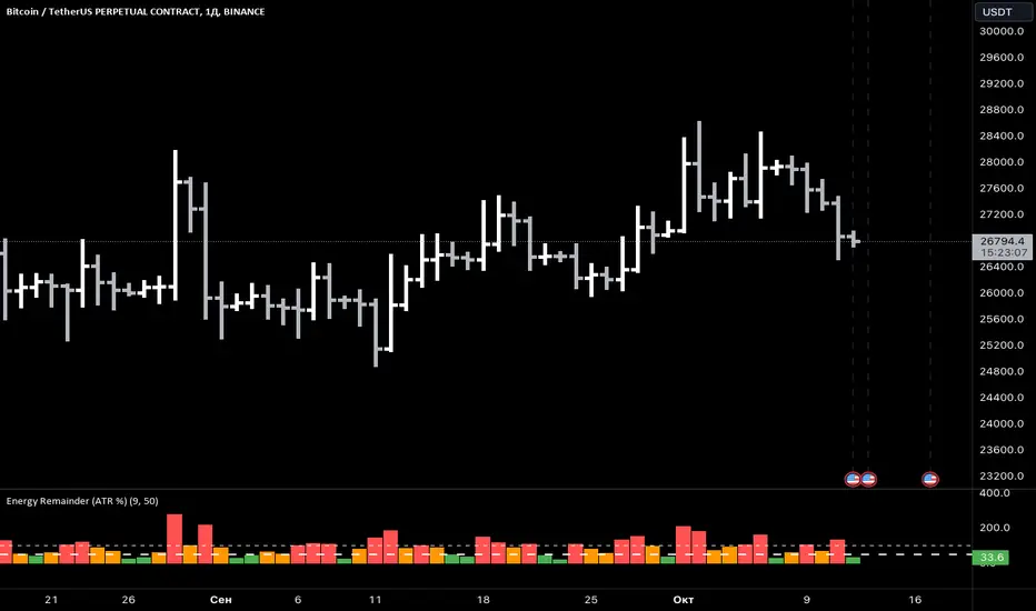This indicator presents a visual representation of the percentage of the Daily Average True Range (ATR) that an asset has covered. The core idea behind the indicator is to gauge the remaining “energy” or potential price movement capacity of an asset within the trading day. By comparing the current intraday range to the daily ATR, traders can determine if there's still room for the asset to move, and hence, if it's an opportune moment to take a position.