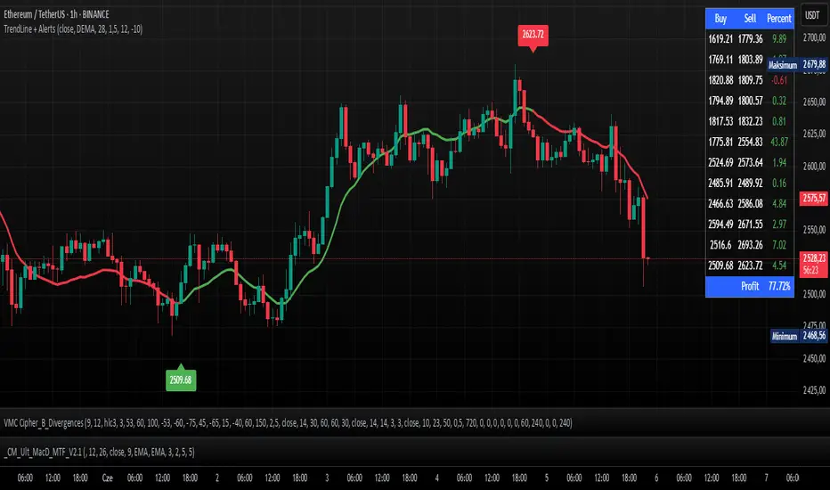 The TrendLine + Alerts indicator is an advanced technical analysis tool designed to quickly identify trend direction using various moving averages and RMSD deviation. It dynamically generates buy and sell signals and visually marks entry points with price labels on the chart. Additionally, an optional transaction table can be toggled on or off, displaying buy and sell prices along with the percentage returns of individual trades and an aggregated summary row, facilitating the evaluation of trading strategy performance.