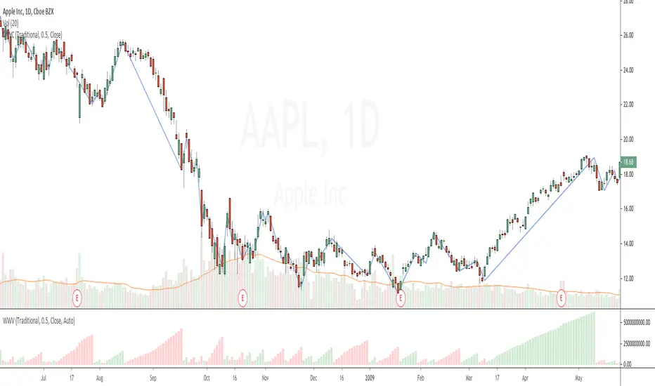 This indicator is based on the Weis Wave described by David H. Weis in his book Trades About to Happen: A Modern Adaptation of the Wyckoff Method, more info how to use this indicator can also be found in this video. The Weis Wave is an adaptation of Richard D. Wyckoff’s method Wave Charts. It works in all time periods and can be applied to all asset types. For assets that do not support volume Weis propose in his book to use the true range instead, so if you want to use this indicator for assets that do not support volume, make sure to enable the checkbox "Use True Range instead of Volume".