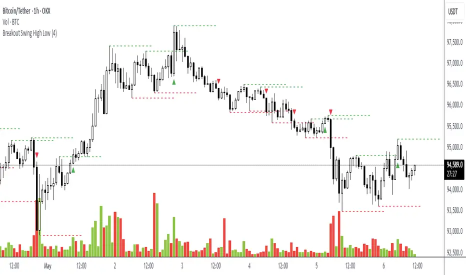 Visualization: Swing high levels are drawn as green dashed lines, and swing low levels as red dashed lines, extending 15 candles for clarity. Breakout signals are marked with small triangles.
