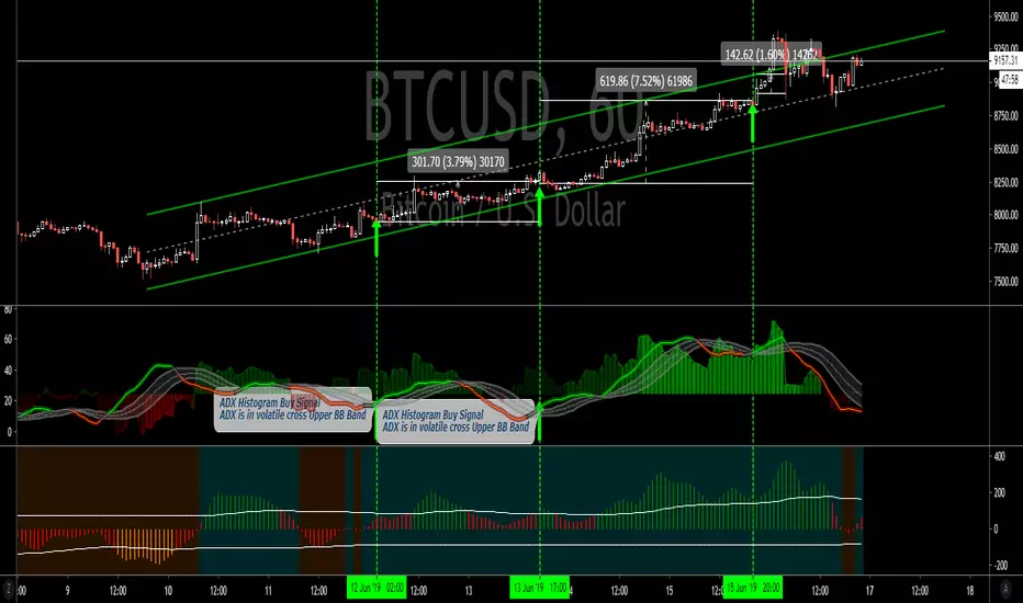 For example if you detect a up channel...you will buy when DMI histogram is in buy signal (green) and Adx is abobe the bollinguer band. and in e green color.
