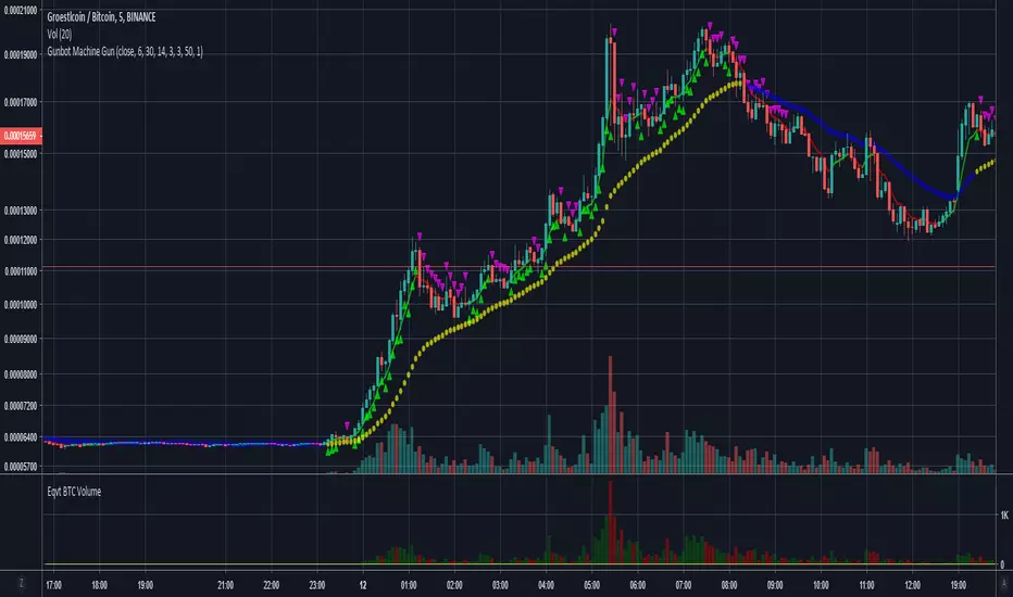 This is how the Gunbot Machine Gun works: I have 200 slots for alerts in Tradingview. I use all of those slots to set buy and sell alerts on BTC pairs. I have volatility filter in my script so the Machine Gun will only start firing out rounds (Buy alerts) when the volatility becomes high. Tradingview sends email to gmail. Gunbot waits for the email, once it reads it Gunbot will action the email (buy/sell depending on the message). Gunbot buys the coin based on email message received from Tradingview. It will be rapid fire, accumulating buys while coin is pumping up. Then when the dust settles and momentum starts dying, the script will throw a hand grenade (pink triangles), send a sell signal/email then Gunbot reads that email and executes the sell all trade.