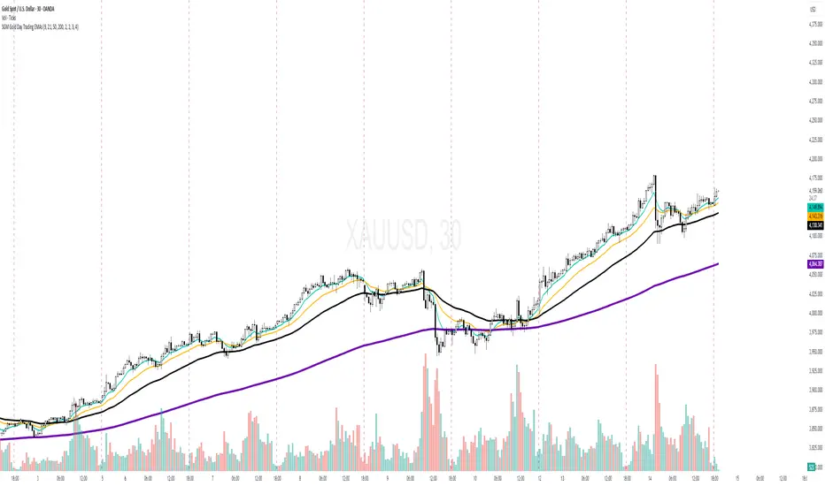 This tool plots four Exponential Moving Averages (EMAs) with practical default periods for gold intraday analysis: 9 (Momentum), 21 (Pullback), 50 (Trend Filter), and 200 (Macro). The goal is to provide a clear, multi-horizon structure so traders can quickly assess momentum, pullbacks, intermediate trend, and long-term bias on the same chart.