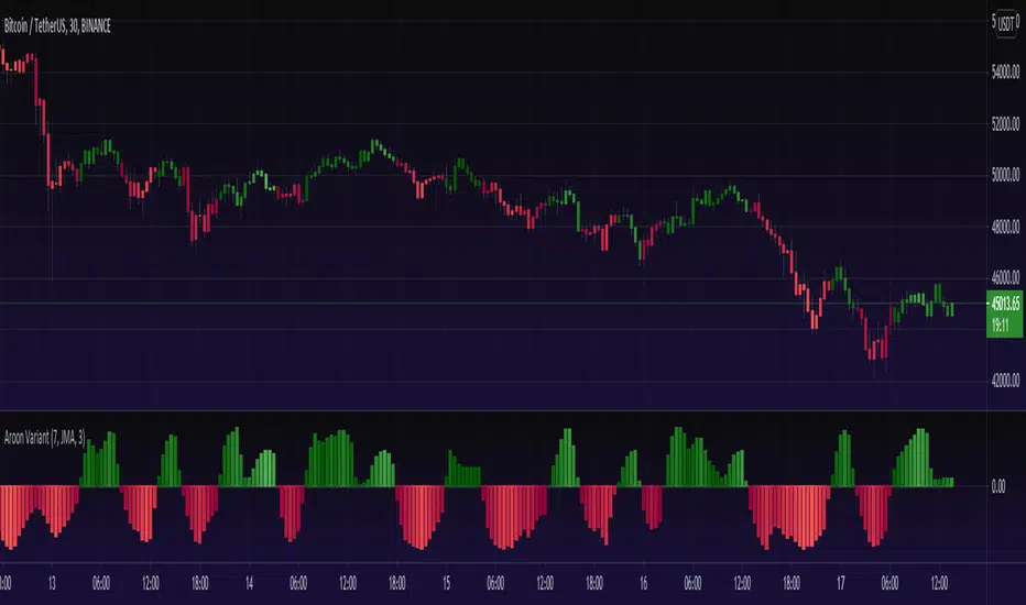 Arron Variant is based on the original Arron but with a twist, Arron Variant measures the difference between highs and lows over a time period, opposed to the original Arron who measures the time (bars) between highs and lows over a time period.