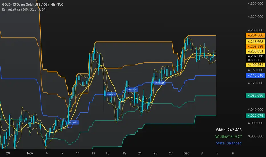 RangeLattice constructs a higher-timeframe scaffolding on any intraday chart, locking in structural highs/lows, mid/quarter grids, VWAP confluence, and live acceptance/break analytics. It provides a non-repainting overlay that turns range management into a disciplined process.