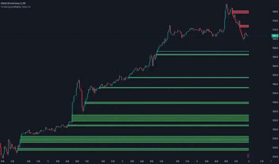 The Fair Value Gap indicator draws customizable zones on the chart, representing bullish or bearish areas with distinct green or red colors. These zones highlight market gaps where price action has left a void, indicating the possibility of significant order activity in that region.