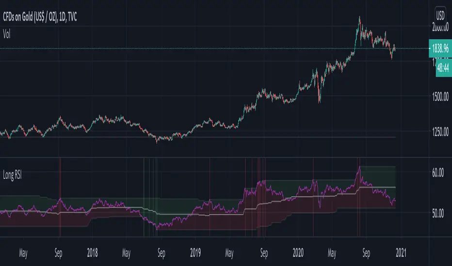 This script solves that by using a specific look back period (selectable, but the standard is 1 year), and plotting the highest/lowest value that the RSI has had for that time period.