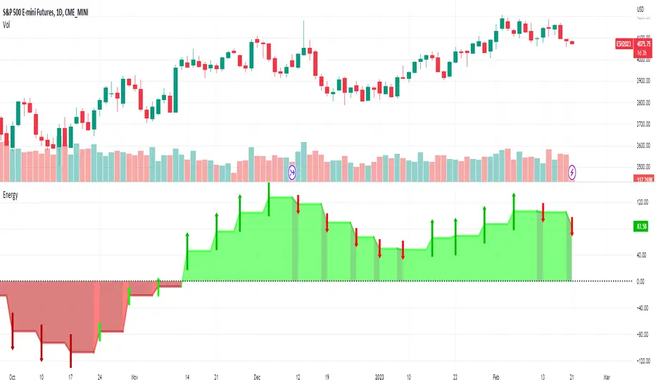 This script quantifies the energy in a price move by comparing the relationship of 3 configurable exponential moving averages present on a slightly higher timeframe (chosen automatically based on the charts current period).  It uses the closing price by default, but this is also configurable using the Source input.  There are a few ways to use the information in this indicator.  One is to use the values above zero (colored green) to provide a bullish bias for future price, and values below zero (colored red) indicating a bearish bias for future prices.  This bias can be shown to be increasing or decreasing base on the upward or downward slope of the indicator.  The green and red arrows can be enabled to show if the bias is strengthening or weakening based on the direction they are pointing.  Finally, the height changes in the peaks of the indicator can be used to show divergence in the strength of extreme price moves to show when a pull back or reversal may occur.