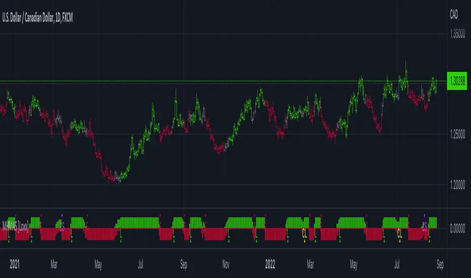 Multi HMA Slopes [Loxx] is an indicator that checks slopes of 5 (different period) Hull Moving Averages and adds them up to show overall trend. To us this, check for color changes from red to green where there is no red if green is larger than red and there is no red when red is larger than green. When red and green both show up, its a sign of chop.