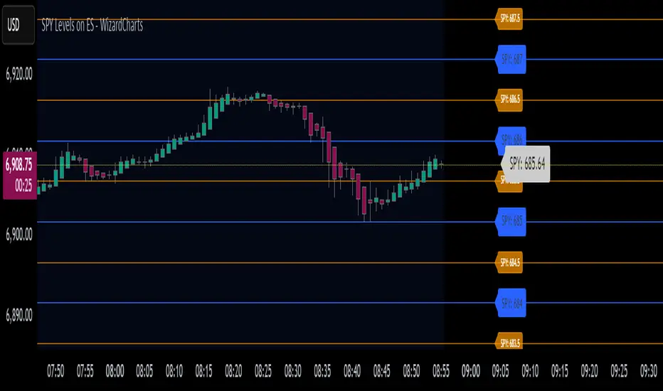 The indicator fetches real-time SPY prices and calculates the 10 closest whole number levels (e.g., 580, 581, 582) plus half levels (580.5, 581.5, 582.5) around the current price. When applied to ES or MES charts, it automatically scales these levels to match futures pricing, giving you precise SPY-correlated support and resistance zones.