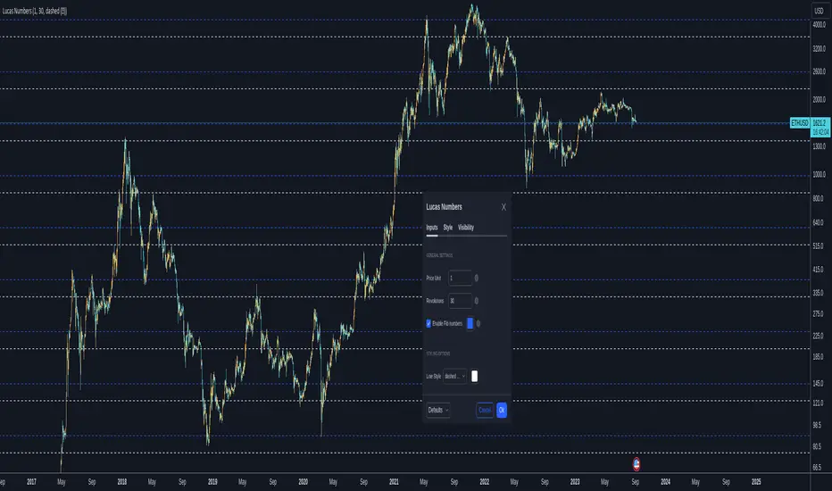 Lucas numbers are related to the Fibonacci numbers and calculated using them as well. It is an easy formula where you'd take the golden ration to the power of n which in the case of this script that would be the revolutions. This script plots Lucas numbers as horizontal price lines. To run this script, turn your "Auto" scale off, and keep your chart on "Log" scale. it is important to keep your "Auto" scale off to be able to view your chart without distortions.