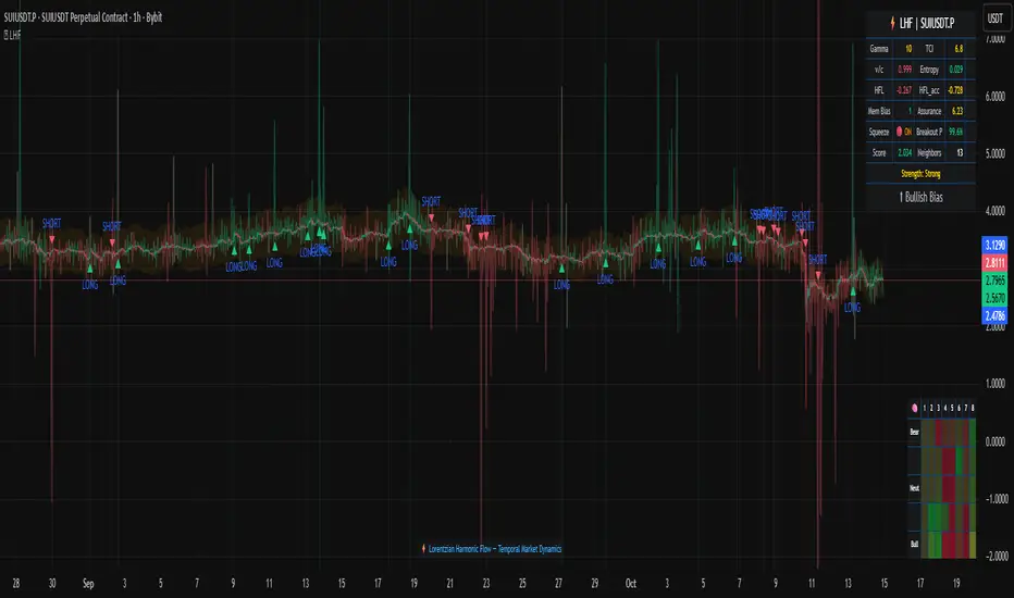 LHF Pro is a research‑grade analytical instrument that models market time as a compressible medium, extracts directional flow in curved time using heavy‑tailed kernels, and consults a history‑based memory bank for context before synthesizing a final, bounded probabilistic score. It is not a mashup; each subsystem is mathematically coupled to a single clock (time dilation via gamma) and a single lens (Lorentzian heavy‑tailed weighting). This script is dense in logic (and therefore heavy) because it prioritizes rigor, interpretability, and visual clarity.