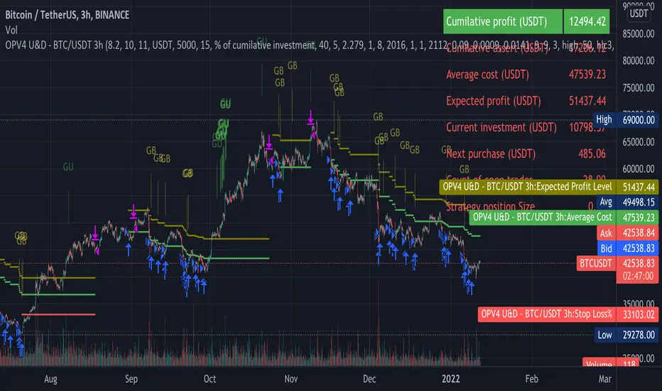 After evaluating different parameters provided by those indicators, script is in a possition to determine optimul positions to enter in to market as well as exit from the market. In some cases stratergy will exit fully or partially depends on the situation. Other than that, this strategy is in a possition to calculate and specify the quantity you need to buy or sell depending on market situation. You can specify amount available for investment and how many times you are going to average (if downtrend). Parameters are optimised to BTC/USDT, 3h standerd candlestic chart.
