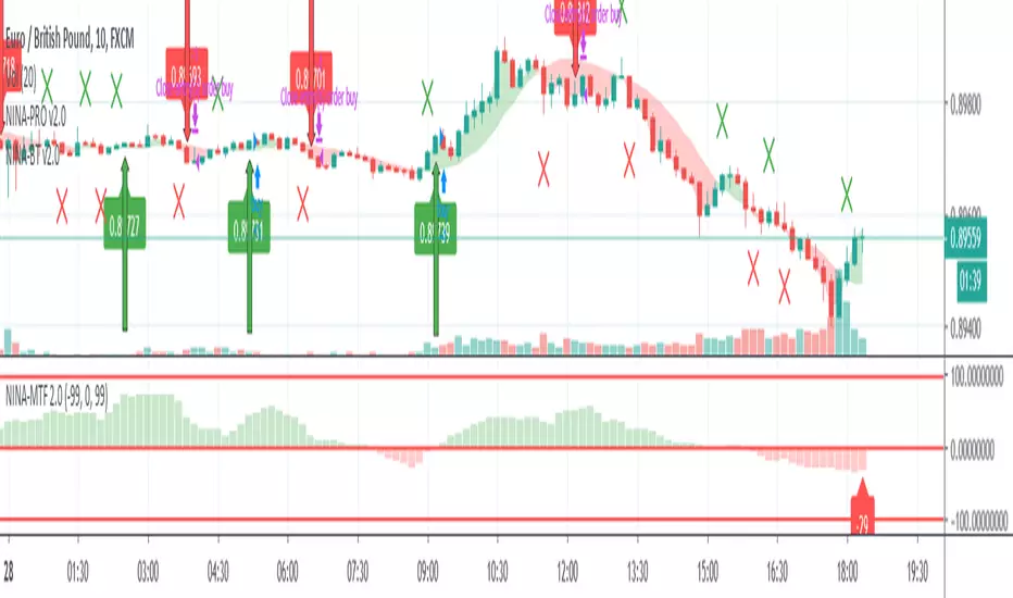This Algo is called NINA-MTF (Multi Time Frame) and is based on mathematical formula over 11 timeframes to create trend signals based on the current market conditions.