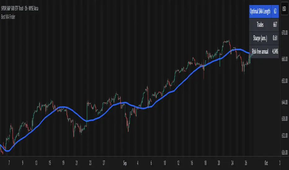 This script, Best MA Finder: Sharpe/Sortino Scanner, is a tool designed to identify the moving average (SMA or EMA) that best acts as a dynamic trend threshold on a chart, based on risk-adjusted historical performance. It scans a wide range of MA lengths (SMA or EMA) and selects the one whose simple price vs MA crossover delivered the strongest results using either the Sharpe ratio or the Sortino ratio. Reading it is intuitive: when price spent time above the selected MA, conditions were on average more favorable in the backtest; below, less favorable. It is a trend and risk gauge, not an overbought or oversold signal.