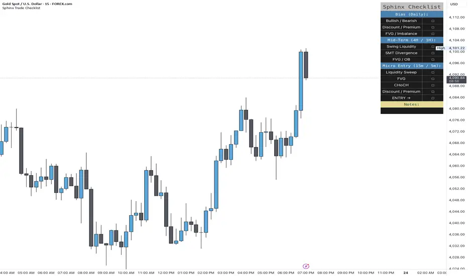 Sphinx Trade Checklist — Your Rule-Based Trading CompanionSphinx Trade Checklist is not a price-based indicator — it’s a structured decision-making tool designed to help traders follow a consistent, rule-based approach before entering any trade.