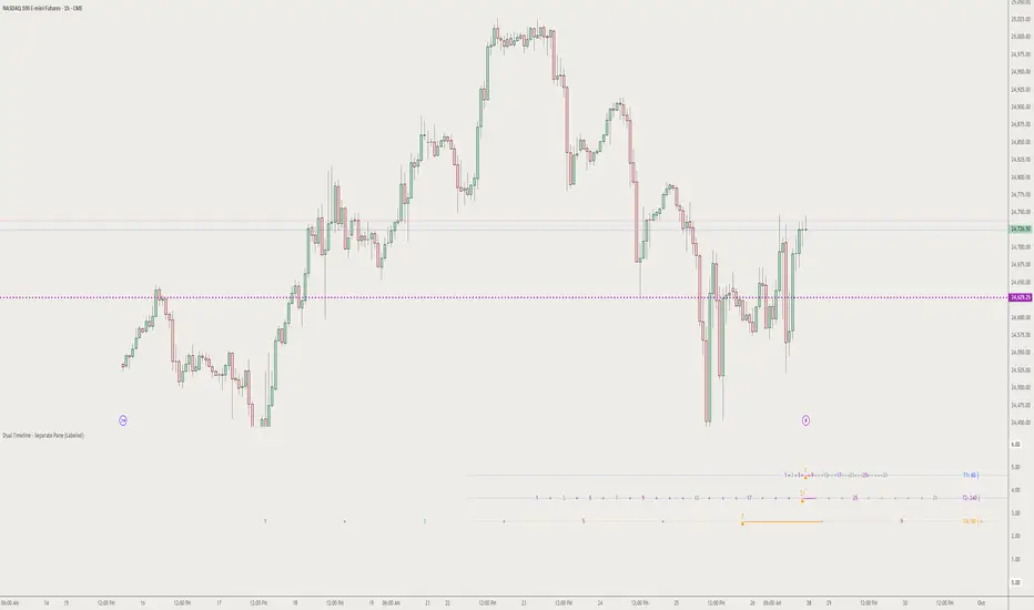 The Dual Timeline - Separate Pane indicator is a sophisticated multi-timeframe analysis tool that tracks and displays up to 4 different timeline counts simultaneously in a dedicated pane below your chart. This indicator is designed for traders who use Time-Based Trading (TDT) strategies and need precise tracking of candle/bar counts across multiple timeframes.